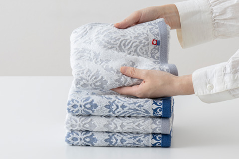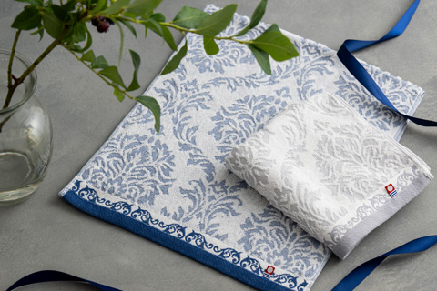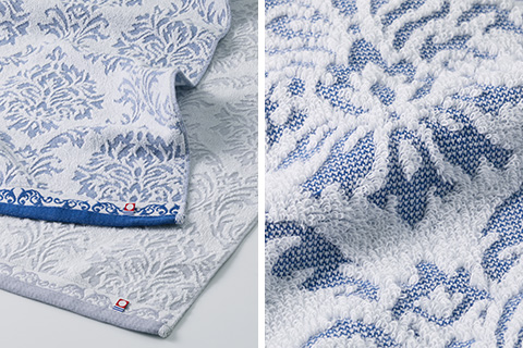 ヨーロッパ邸宅を飾る優美な内装を思わせるクラシカルなオーナメント柄を、今治タオルが得意とするジャカード織で表現しました。